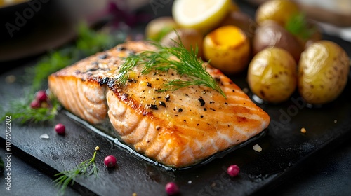 łosoś, filet z łososia, cytrynowy sos, lekkie danie, eleganckie serwowanie, pieczone ziemniaczki, pieprz różowy, mikro zielenina, dekoracja talerza, estetyczna prezentacja, ceramiczny talerz, ciemna c
