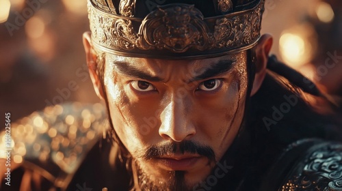 Close-up portrait of a warrior with a golden crown and intense gaze