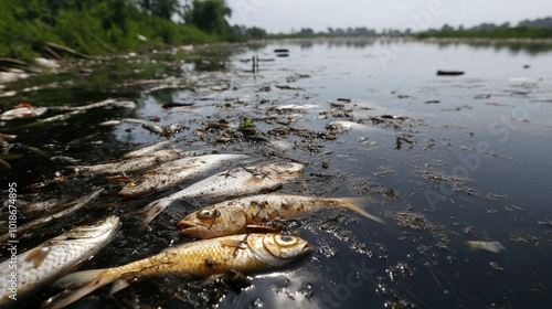 A river heavily polluted with floating garbage and a visible oil sheen, with dead fish near the surface, showcasing water pollution's deadly impact.