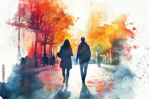 A pair of people strolling along a urban road, possibly on their way to meet or catch up