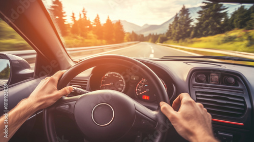 Kierowca pewnie trzyma ręce na kierownicy, koncentrując się na drodze przed sobą. Przez przednią szybę widać rozciągający się autostradowy krajobraz.