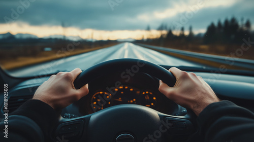 Kierowca pewnie trzyma ręce na kierownicy, koncentrując się na drodze przed sobą. Przez przednią szybę widać rozciągający się autostradowy krajobraz.