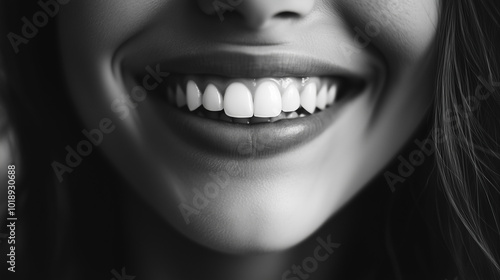 Promienny uśmiech kobiety to wyraz czystej radości. Jej zęby delikatnie błyszczą, a uśmiech rozciąga się od ucha do ucha.
