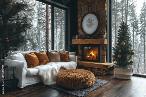 Przytulny salon z kominkiem, kanapą i choinką, z dużymi oknami, z których roztacza się widok na zaśnieżony, zimowy las.