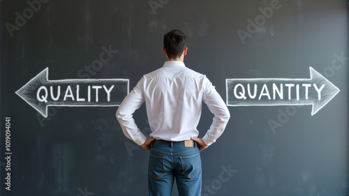 A man stands thoughtfully between two arrows labeled "Quality" and "Quantity," symbolizing the important decision-making process in business and life. Ideal for articles on productivity or management
