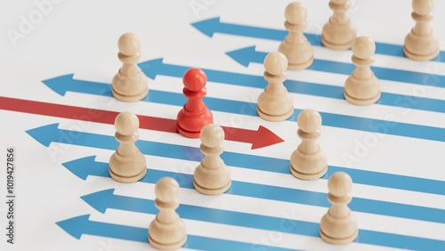 3d illustration of many white pawns going on the same direction and a RED one going on the opposite side.3D rendering on white background.
