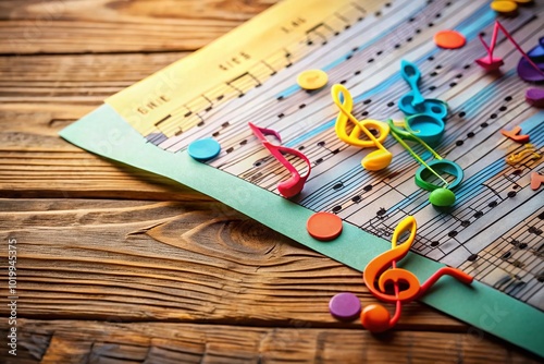 Sheet music with notes and symbols on a wooden background for musical composition and creativity