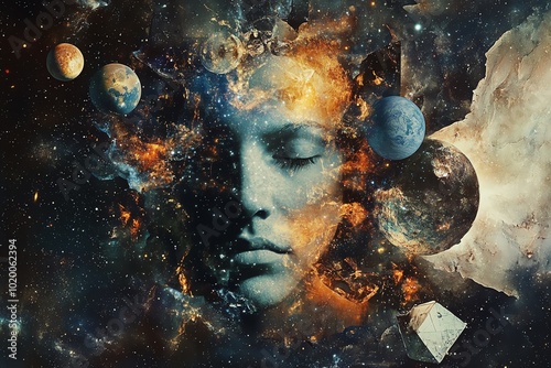 A cosmic collage where planets, stars, and galaxies are mixed with abstract human faces and geometric shapes