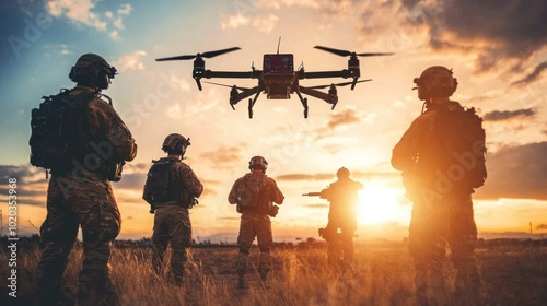 Military precision-guided munitions and smart combat systems, featuring autonomous drones and AI technology