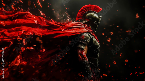 A powerful armored warrior with a red cape stands tall as embers swirl around, evoking strength, battle, and heroism in a dark, cinematic scene