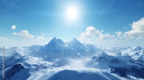 Majestic snow-covered mountains under a bright blue sky and sun.