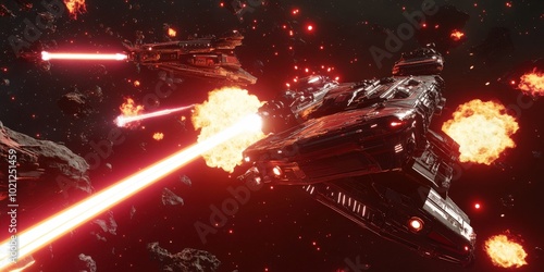 Futuristic starships engage in an epic space battle with vibrant explosions and laser beams across a galaxy backdrop.