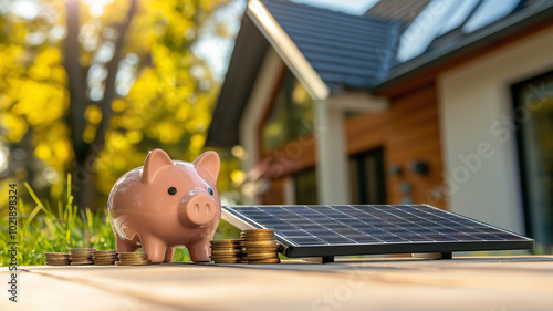 Skarbonka i energia z odnawialnych źródeł energii. Czyste powietrze. Oszczędność. Panele fotowoltaiczne