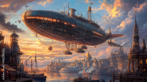 a massive steampunk airship docked at a floating city, with passengers disembarking and goods being unloaded by steam-powered cranes. Steampunk Airship. Illustration