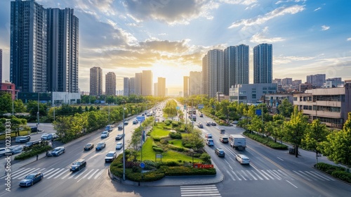 A city intersection with organized traffic flow, green spaces in the center, and modern, sleek buildings, promoting peaceful urban living.