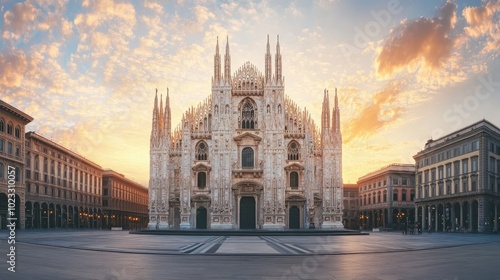 A wide-angle view of a grand cathedral with towering spires against an open sky. Space for text