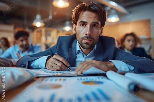 businessman presenting sales targets to his inattentive and sleepy team during a corporate meeting.