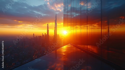 A stunning sunset over a modern city skyline, as seen from the rooftop of a glass building.