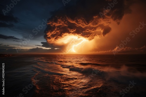 An intense lightning storm erupts over an ocean at twilight, with fiery orange clouds and stark contrasts, capturing the dramatic power and awe-inspiring beauty of nature.