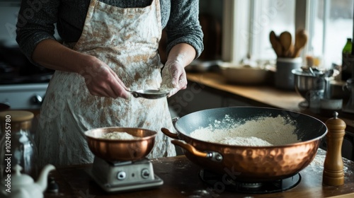 A person measuring flour in a cozy kitchen setting, preparing for baking.