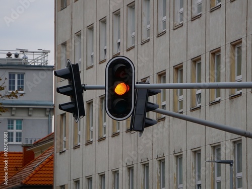 Sygnalizacja świetlna zabraniająca wjazdu za sygnalizator. Sygnał żółty ciągły widoczny na sygnalizacji. System kierujący ruchem drogowym.