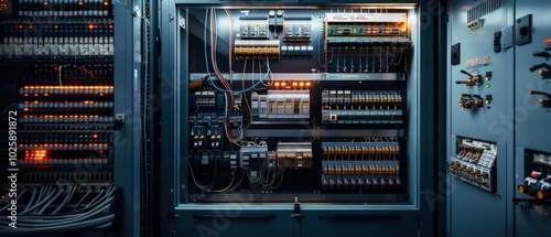 Intricate wires and switches form the complex heart of a server room, glowing with technology and electronic precision.