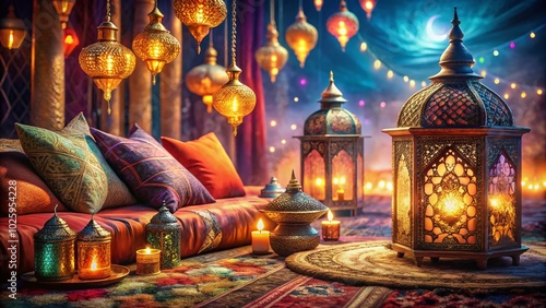 Enchanting 1001 Nights Party Scene with Exotic Decor and Vibrant Colors