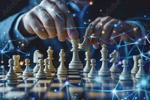 Close-up of a visionary leader's hands strategically moving chess pieces on a digital board symbolizing innovative leadership in business