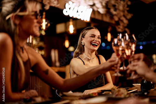 Group of Friends Toasting with Wine in a Cozy Restaurant Setting