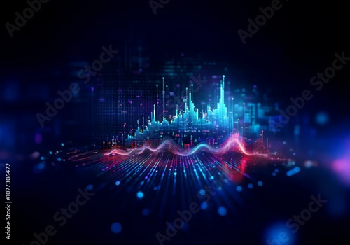 Abstract digital cityscape with neon glowing lines, data visualization, and digital information.