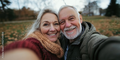 A joyous senior couple taking a selfie outdoors surrounded by lush greenery, illustrating love, companionship, and togetherness during a leisurely walk.