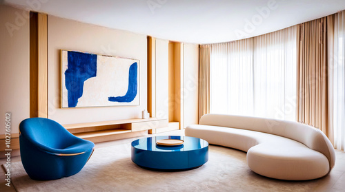 salon z niebieskim krzesłem i dwoma białymi krzesłami, modernizm, futurystyczny wystrój, modernistyczne wnętrze, nowoczesne meble galeryjne, niebiesko-biała kolorystyka