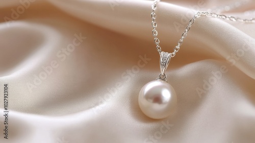 A delicate pearl pendant hanging from a fine silver chain, displayed on a soft satin background.
