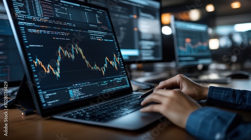 Person analyzing data on laptop with multiple screens in a modern workspace.