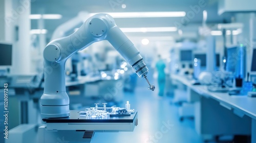 Industrial robot arms for medical device manufacturing, featuring robotic arms performing delicate assembly and testing of medical devices, symbolizing accuracy,