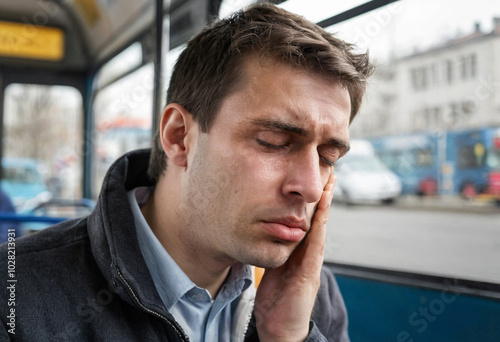 sad desperate young man sitting in the bus while driving, tears in his eyes, tearful, separation and being abandoned or problems and worries, depression and depressive mood