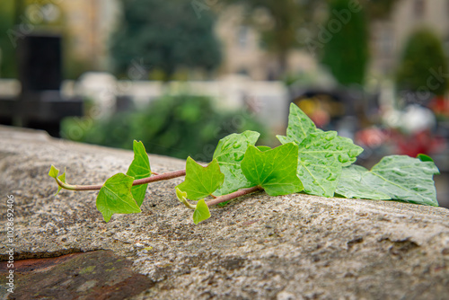a vine climbing up an old ruined wall in a cemetery. green ivy in autumn.