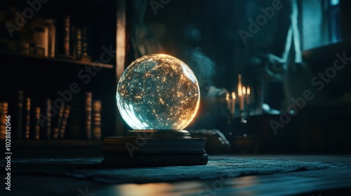 Crystal ball glowing with magical energy, set in a shadowy room, symbolizing mysticism and divination in a magical atmosphere