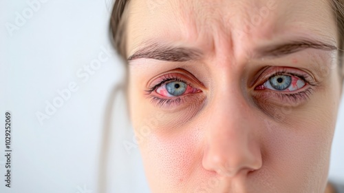 Close-up of a woman's eye with conjunctivitis, showing red, swollen blood vessels.