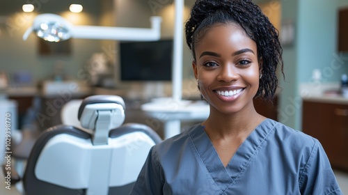 A smiling dental hygienist in scrubs poses confidently in a modern dental office during a routine checkup