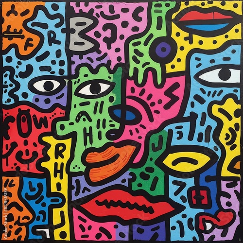 Colorful abstract portrait featuring vibrant patterns and striking facial features