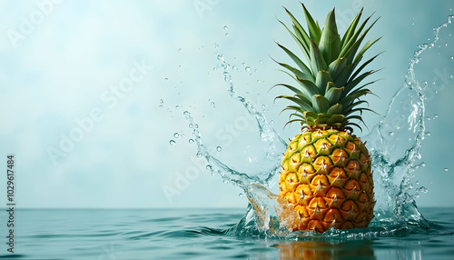 A tropical pineapple surrounded by a dynamic splash of water, ideal for refreshing beverage advertisements and promotions