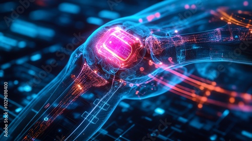 Detailed knee X-ray with holographic medical interface, neon rings highlighting the joint, futuristic treatment, sci-fi, glowing digital elements, 3D illustration