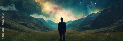 A solitary figure stands amidst a vast, mountainous landscape, gazing upwards at a breathtaking starry sky, searching for meaning and purpose. The scene symbolizes faith, hope, exploration, and the va