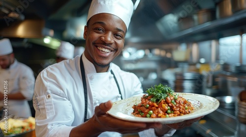 A happy chef in a bustling kitchen, smiling widely as they hold up a perfectly prepared dish for the camera.