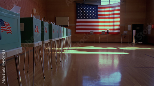 Rząd kabin do głosowania w lokalu wyborczym, ustawionych w równym rzędzie. Każda kabina oferuje prywatność dla wyborców, którzy przygotowują się do oddania swojego głosu. W tle widoczna jest flaga USA