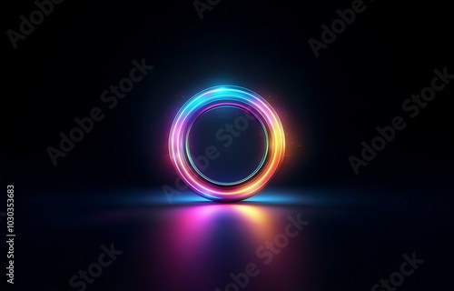 A glowing, iridescent ring stands on a dark, reflective surface.