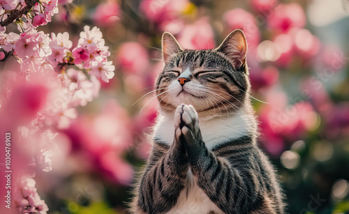 A content cat in a garden full of pink blossoms enjoys a peaceful moment with folded paws during springtime. Generative AI