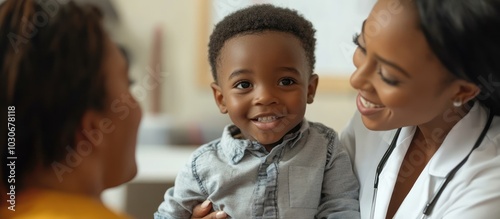 A young boy is smiling while a female doctor holds him. The boy's mother is in the background smiling at him and the doctor.