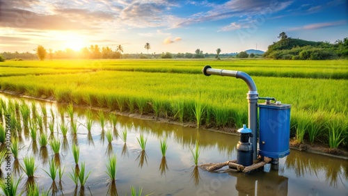 Forced perspective image of irrigation in rice fields using electric water pump from underground